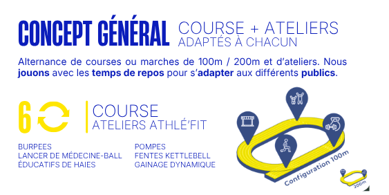 Un concept moderne, dynamique et accessible à tous, inspiré du décathlon et du fitness, pour développer l’ensemble de vos qualités physiques dans une ambiance conviviale.